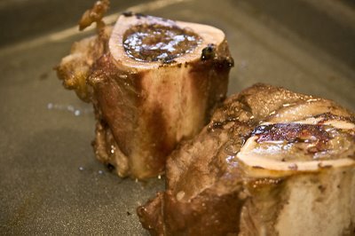 pot-au-feu broth; the cooked marrow being traditionally eaten on toasted bread with sprinkled coarse sea salt. Diners in the 18th century used a spoon especially designed for eating called a "marrow scoop" which was typically silver with a long thin bowl. Marrow bones are also the highlight of the Italian dish ossobuco (braised veal shanks). To keep our adorable dog, Kahlua, happy at dinner time and to keep her from begging at the table, we started giving her a roasted marrow bone each evening while we ate dinner. The marrow is a great source of protein and the chewing the bone helps to keep a dog’s teeth clean. To roast marrow bones you will need: